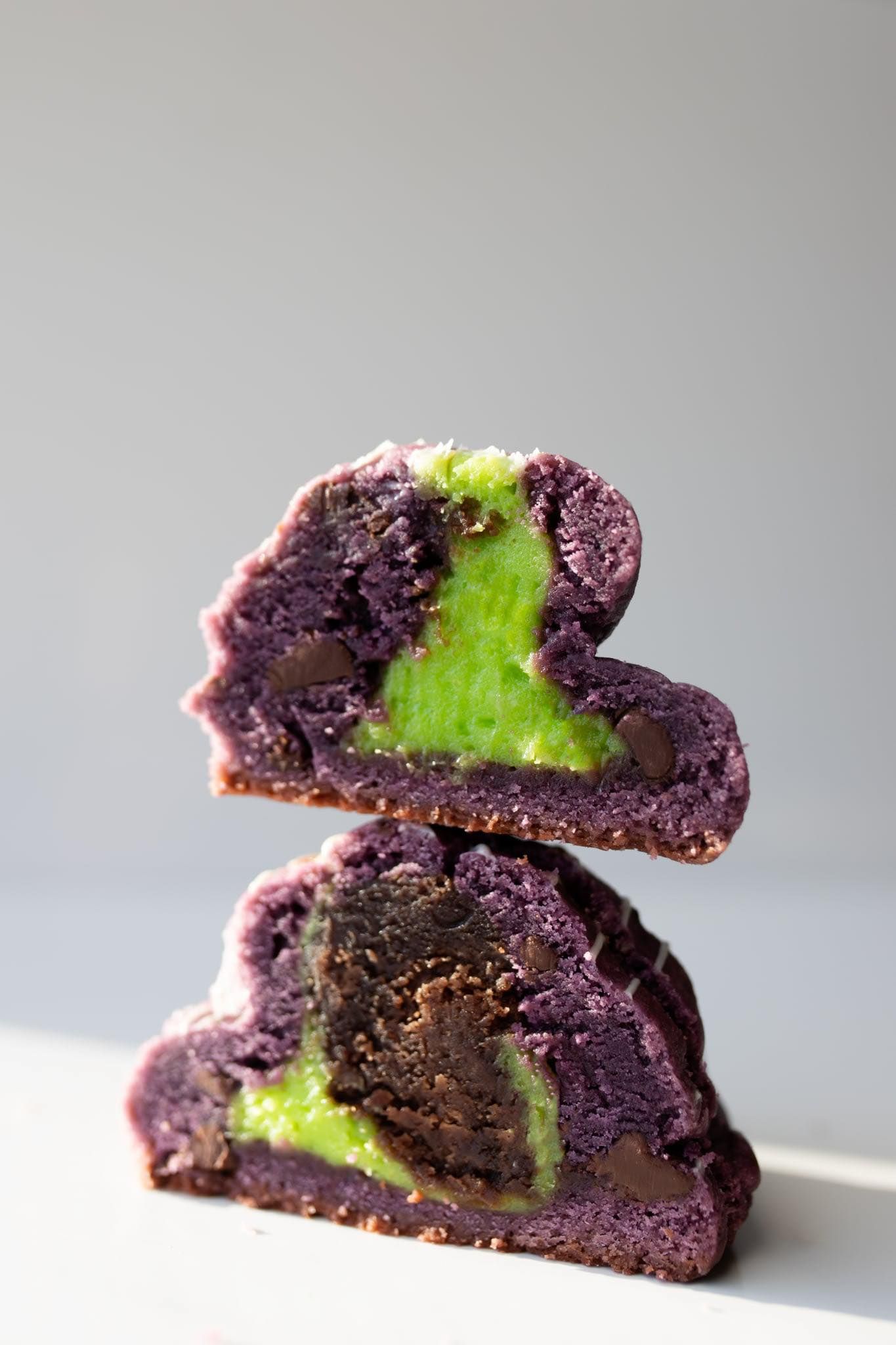 A purple ube chocolate chip cookie with a green cheesecake grin and a brownie heart…. spooky, sweet, and dangerously delicious.